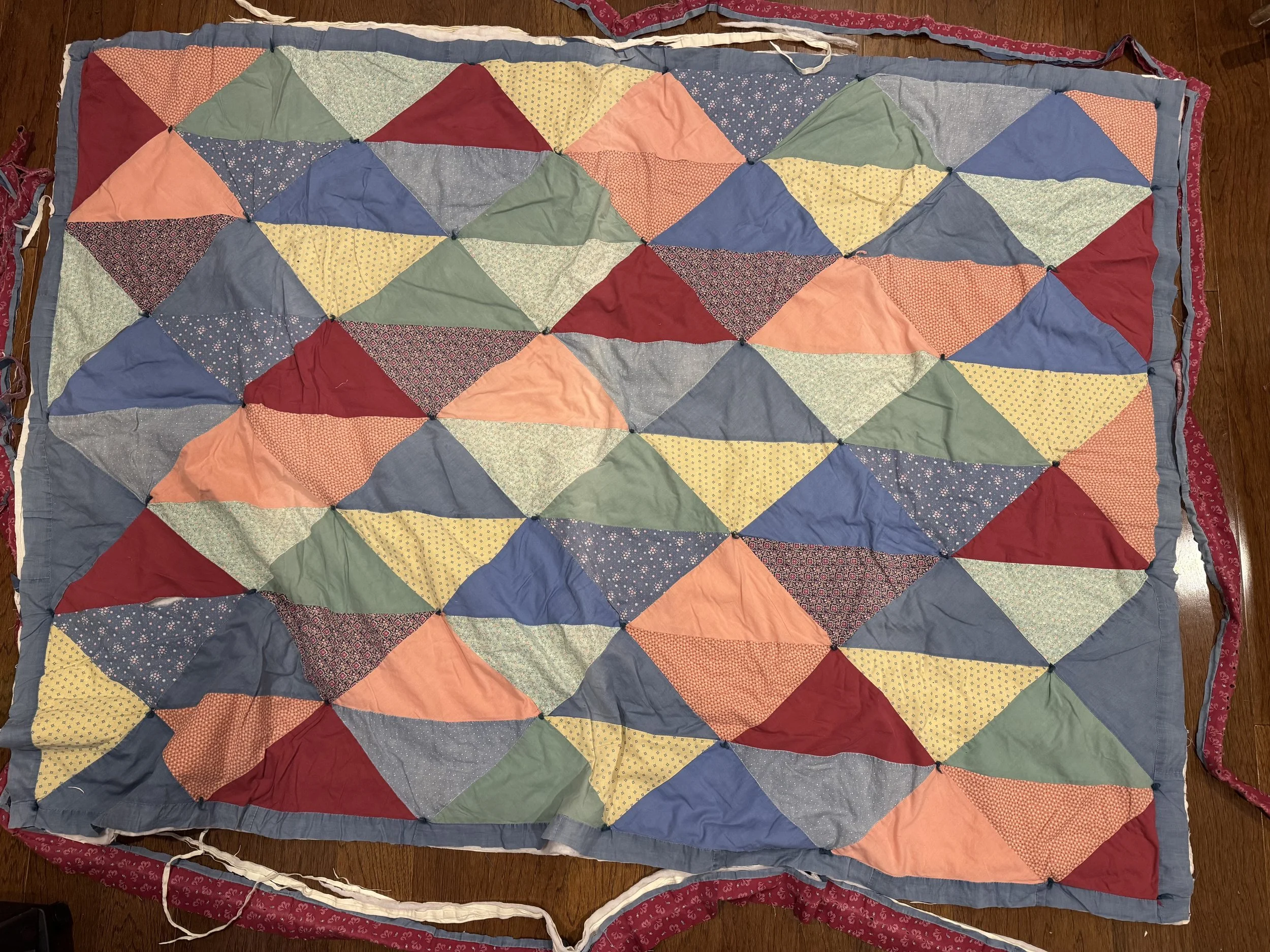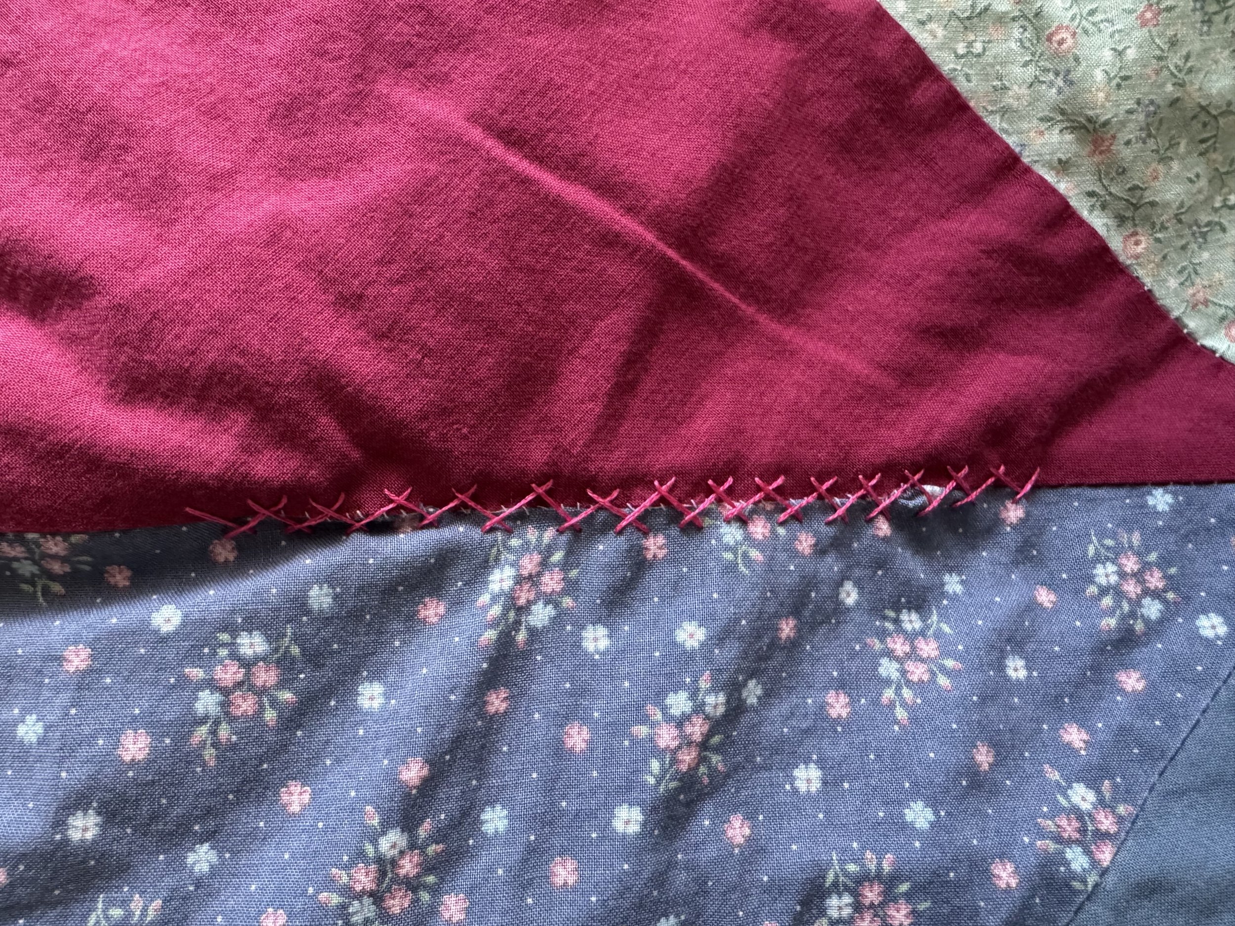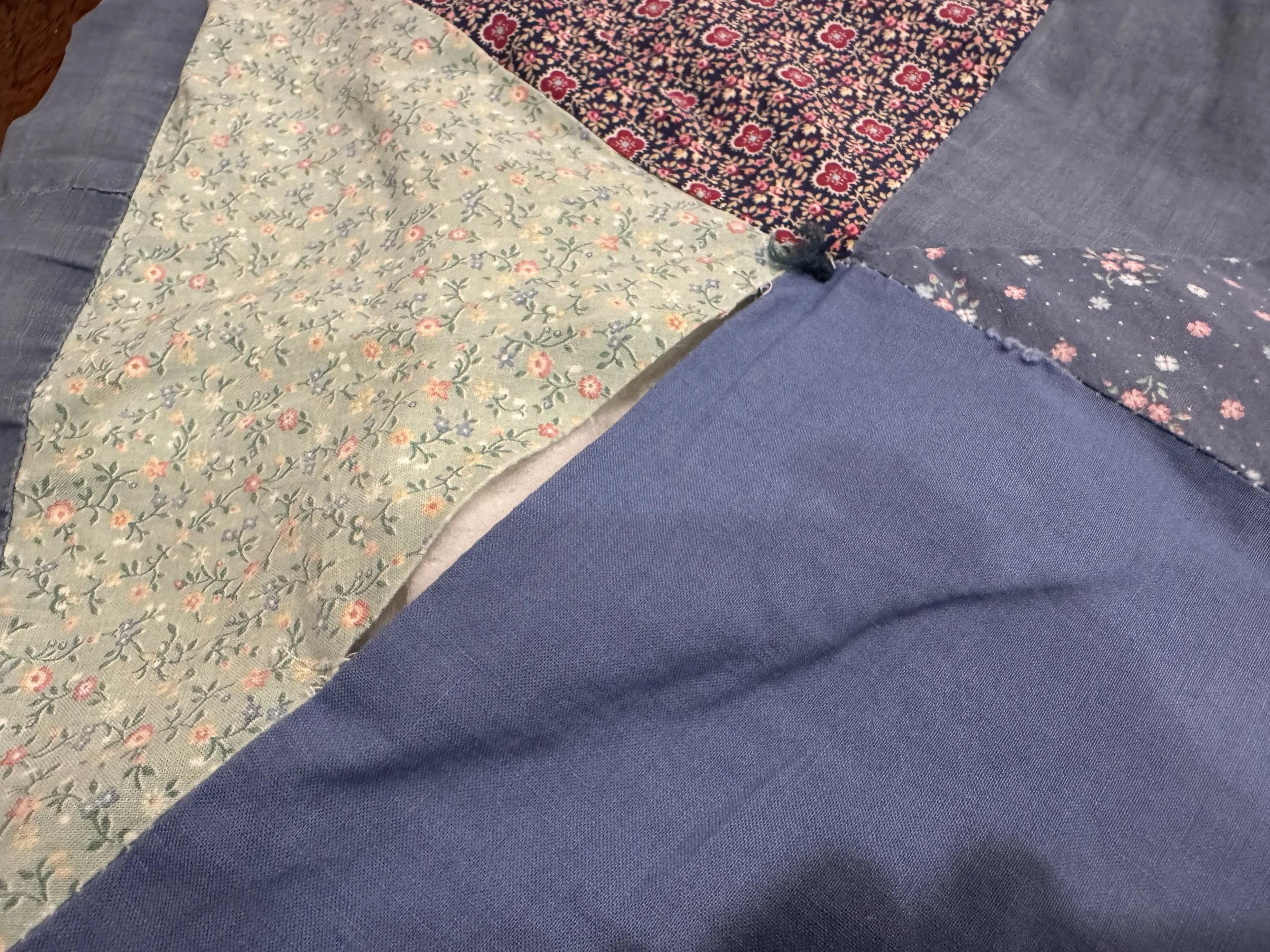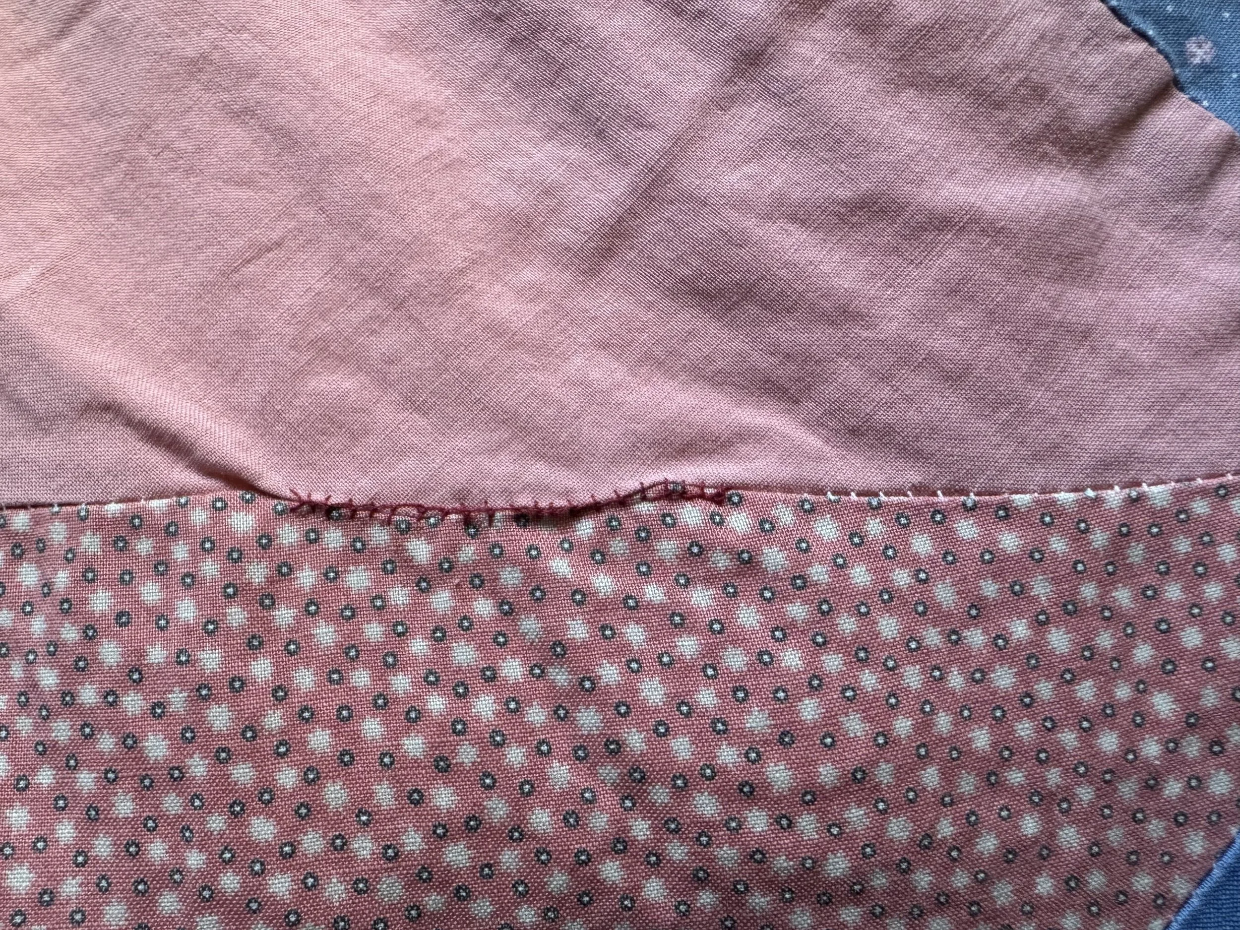 Interesting that the blue printed fabric frayed in this spot, as well. You can see the sewing thread, still intact, on the red fabric. I sure used tiny seam allowances!