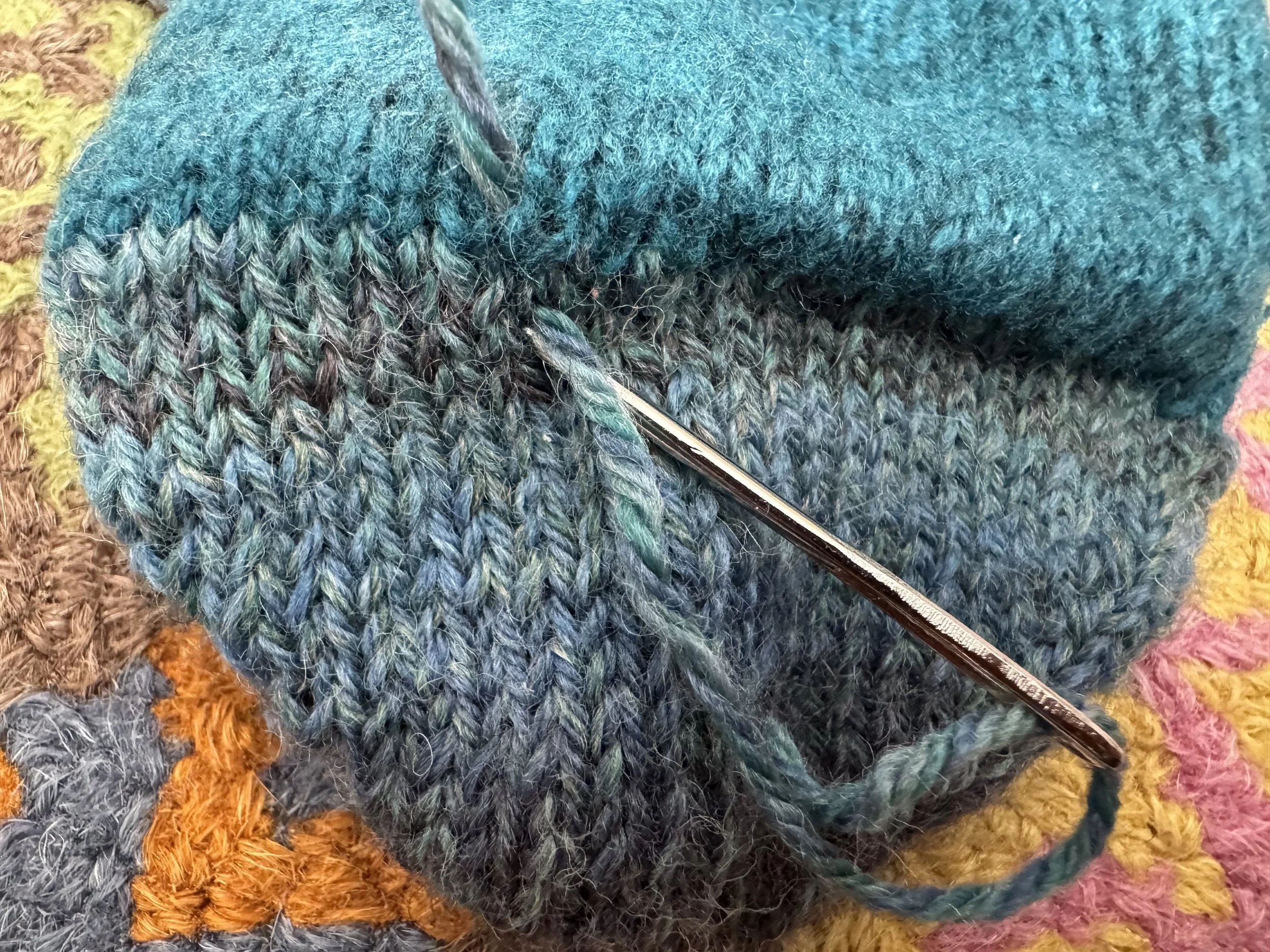 I push through the ends so that the yarn either finishes a knitted “V” or doubles over another thread in a knit stitch.