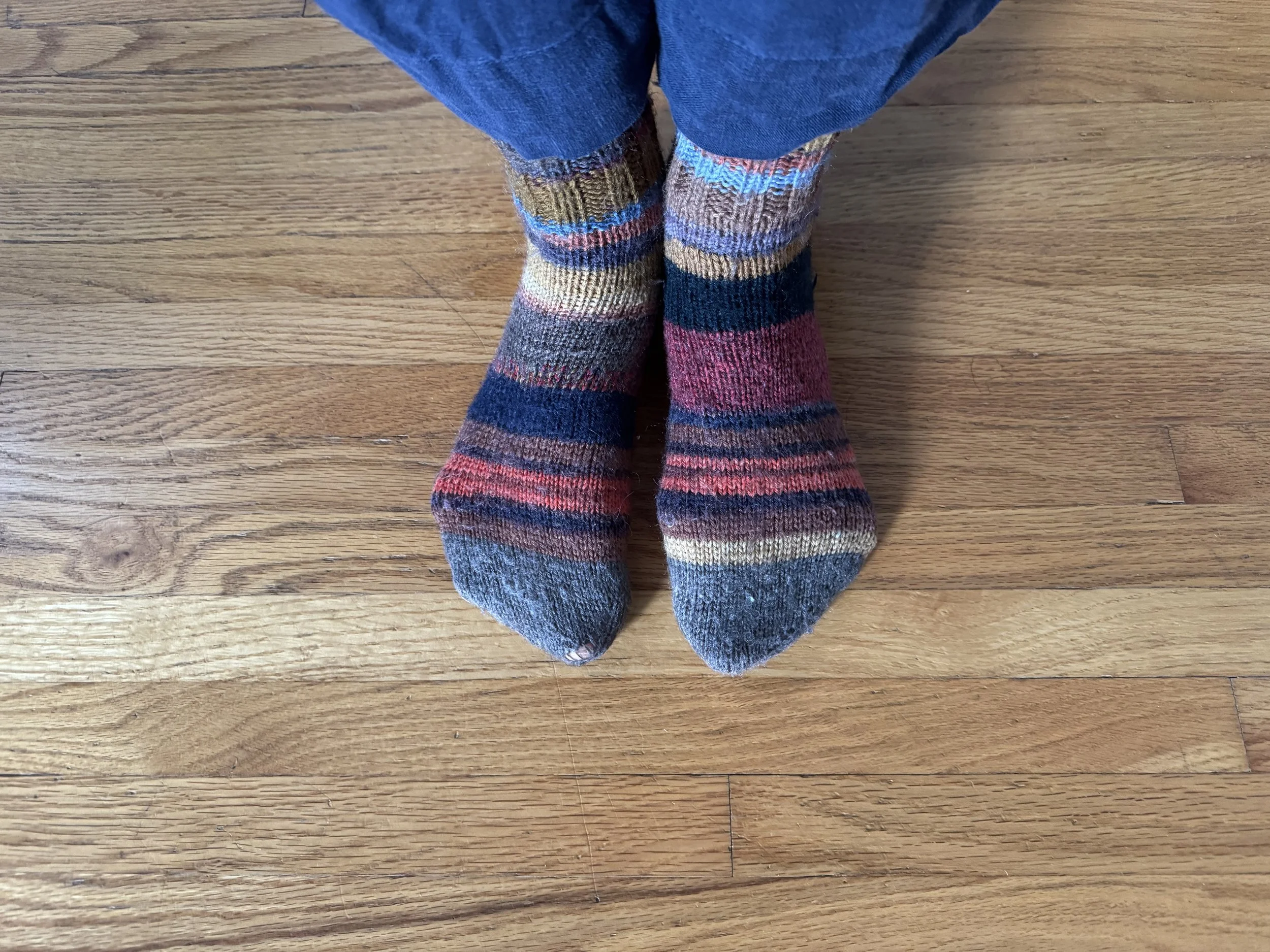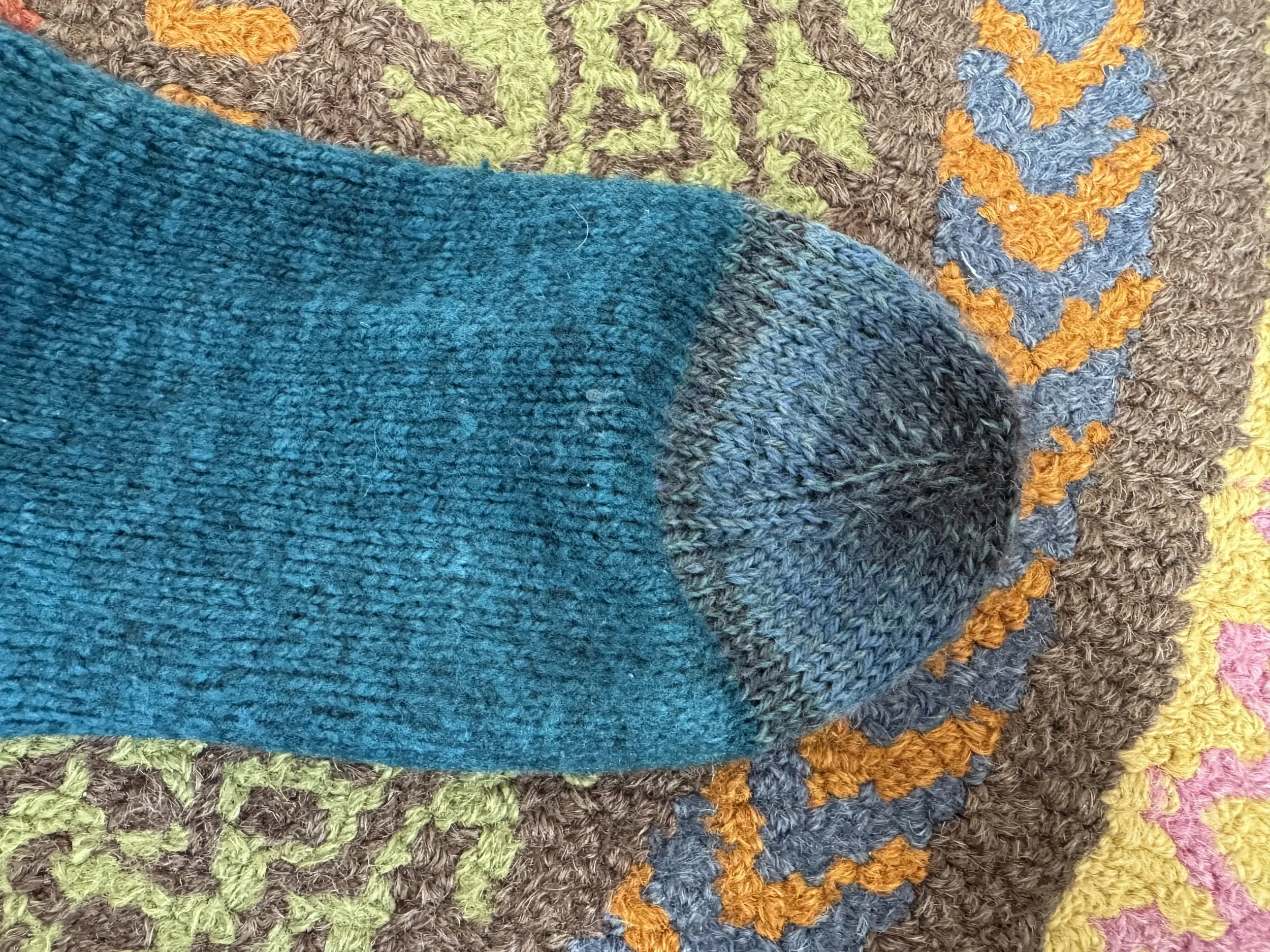 Here is another pair of socks requiring toe work; I knitted these with random leftover yarns, and the yarn I used for the toes has not been durable.