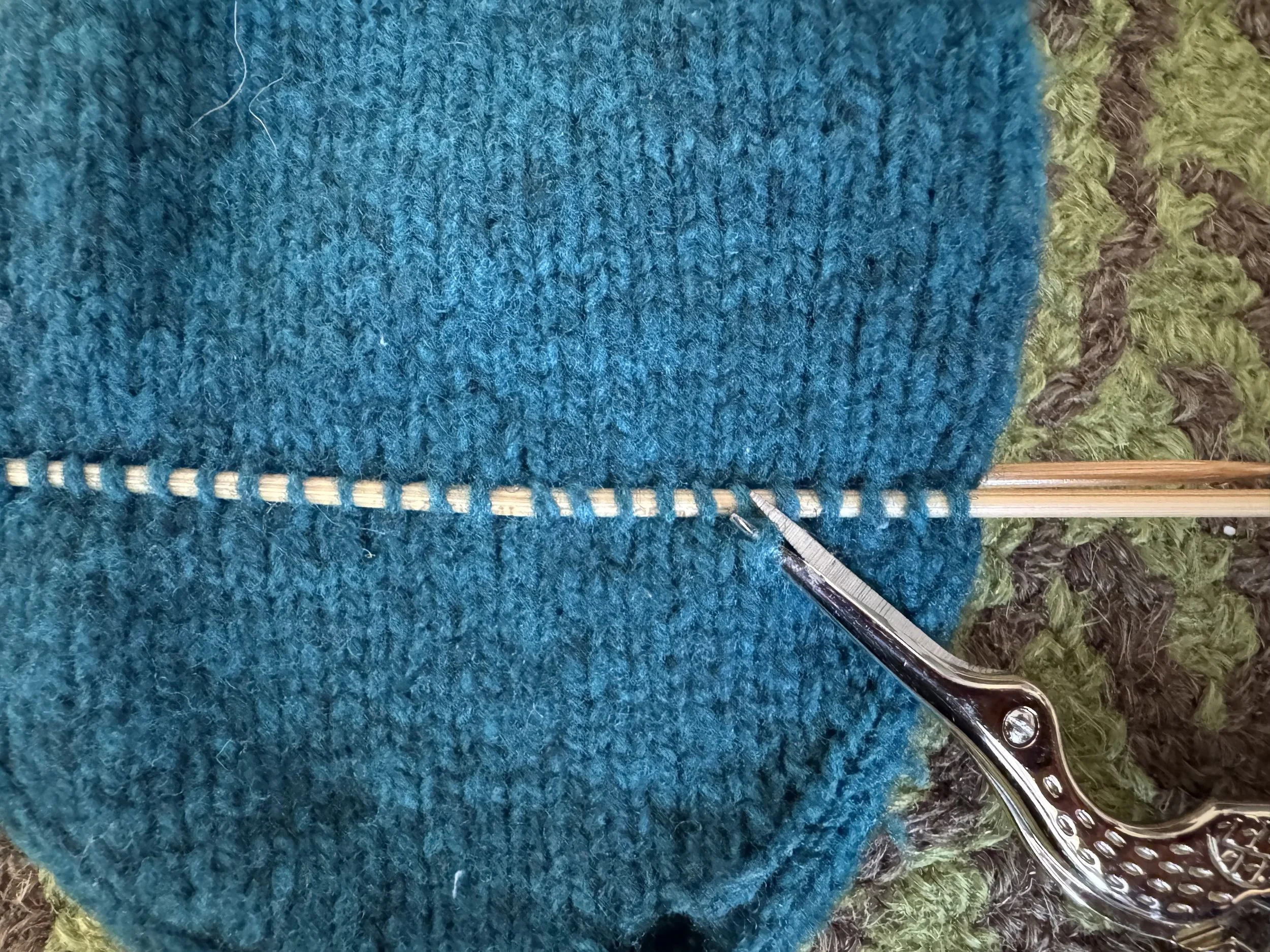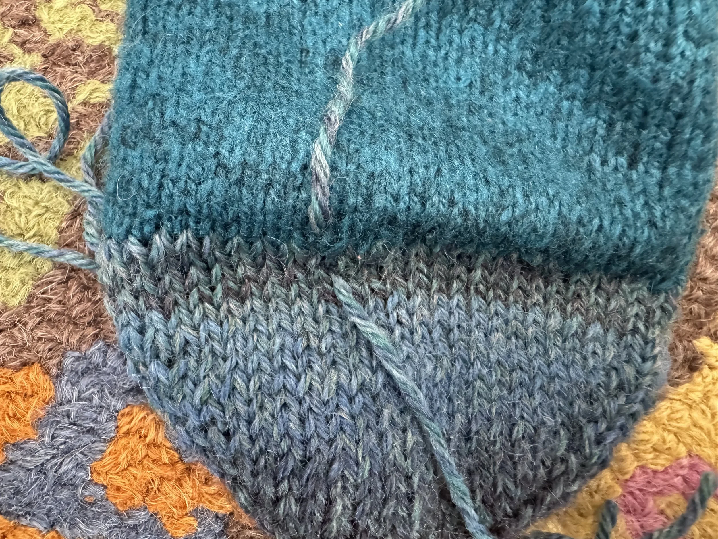 Time to find the row of stitches that are just above where I want to attach the new toe to the old sock. I pick up the left side of each stitch and put it on some waste yarn.