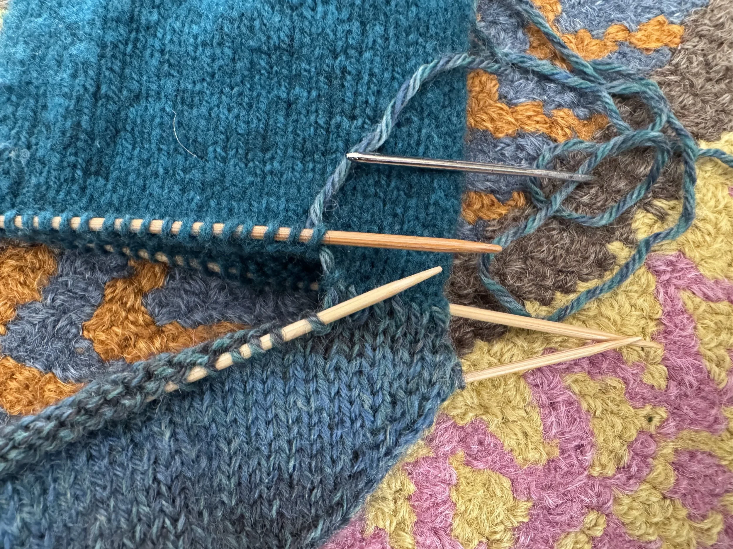 Here we have two new toes and each is now living on two needles. I find it easiest to weave sock parts when I have two flat surfaces to work with, rather than the tubes that leaving the work on three needles would create.