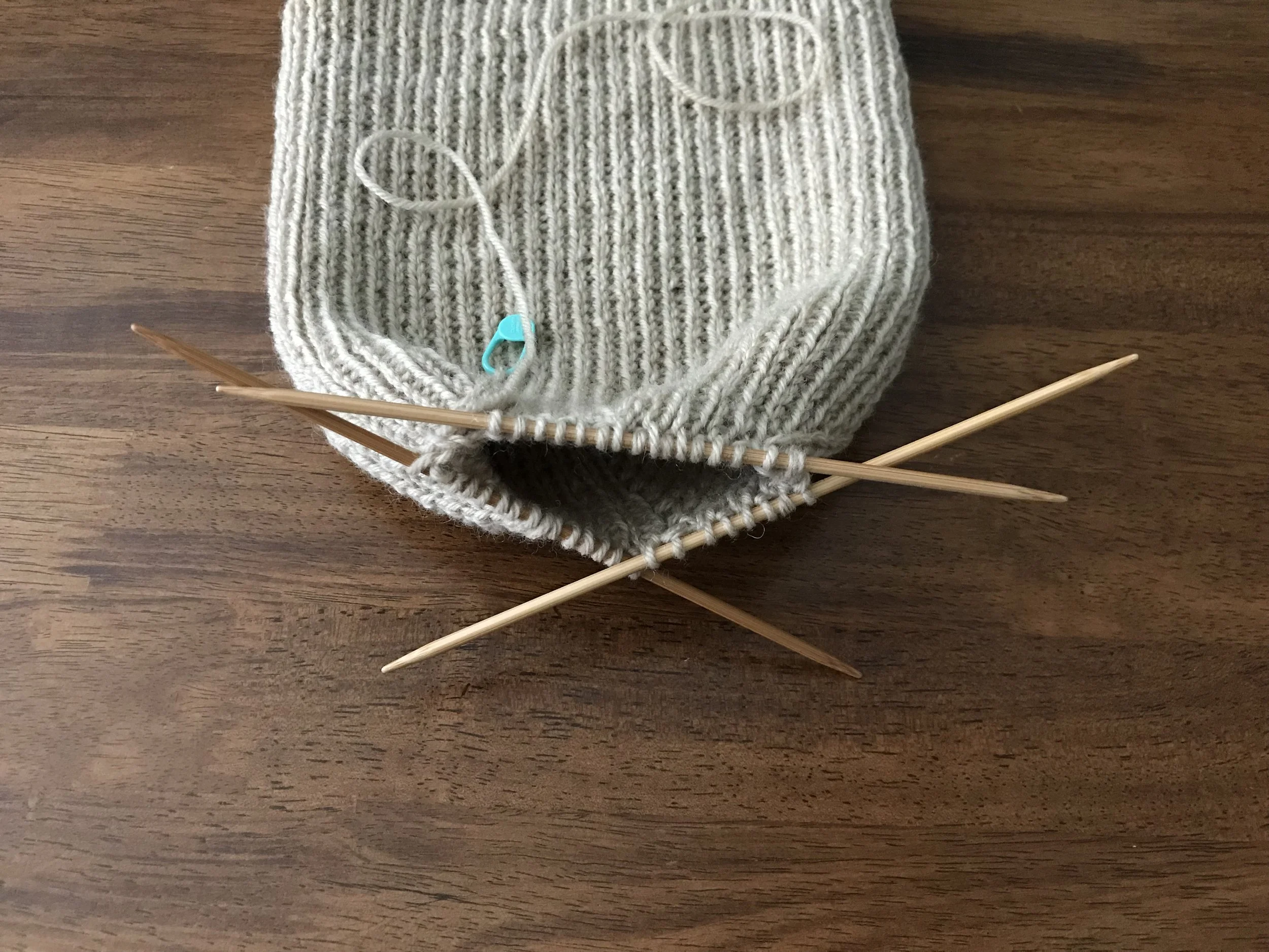 At some point you will feel that you have more needles than stitches. This is a good time to remove one of the dpns; now you’ll have two needles that are holding two decrease sections.