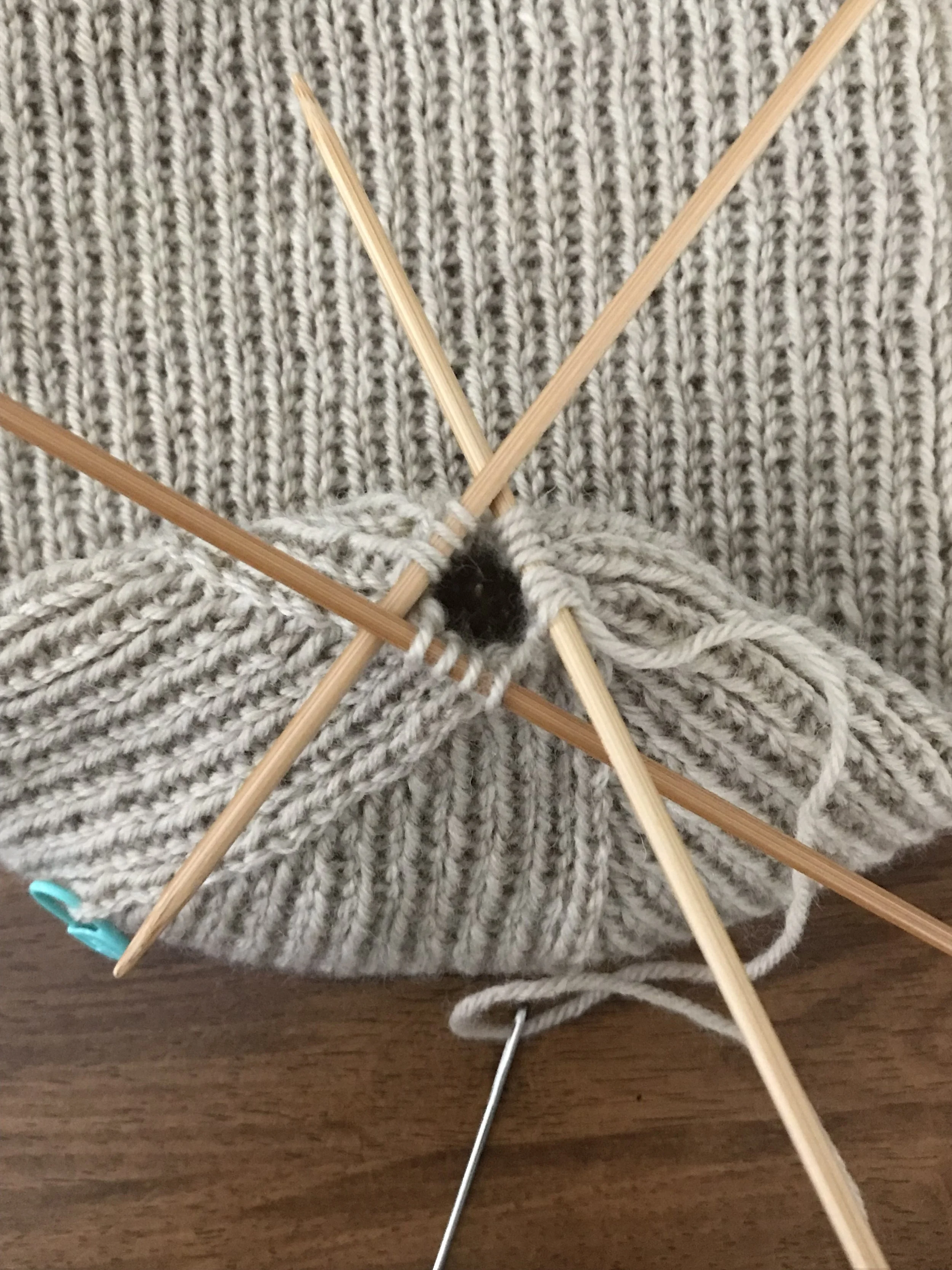 After the dpns have been removed, pull the yarn tightly to close up the hole. Finish off on the inside.