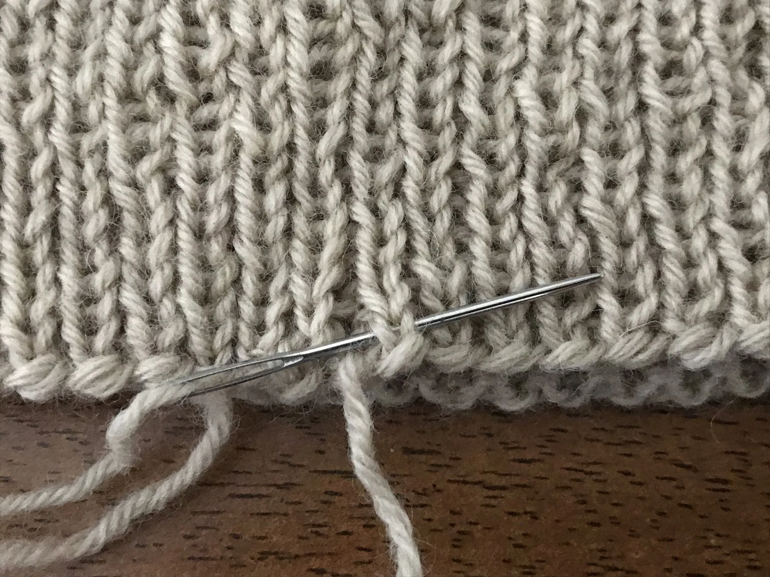 When you have whittled your count down to 15 stitches, you’re done knitting. It’s time to readjust your stitches so that the first stitch is at the beginning of a needle